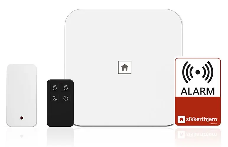 Snjallöryggiskerfi frá Sikkerthjem. Þessi pakki er byrjendapakki, en það er alltaf hægt að bæta meira við í hann og stækka kerfið eftir þörfum. Í þessum pakka er: 1 x móðurstöð. 1 x hurða/gluggaskynjari . 1 x fjarstýring. 1 x límmiði. Þægilegt er að bæta búnaði við, QR -kóði er á öllum aukabúnaði sem auðveldar það að bæta inn búnaði. Kerfinu er stjórnað úr appi sem sett er upp í símanum, ekkert mánaðargjald er til að nota þetta snjallkerfi. Hægt er að setja SIM-kort í móðurstöðina til að hún sé ekki háð því að það sé net á staðnum, þetta hentar vel eins og t.d. í sumarbústaði eða þar sem net er ekki í boði. Einnig er rafhlaða í móðustöðinni og getur hún því haldist gangandi þótt rafmang slái út, en þá lætur móðurstöðina vita að rafmagn hafi rofnað. Allur búnaður nema myndavélar ganga fyrir rafhlöðu og þarf því ekki að leggja að þeim búnaði. Kerfið býður upp á að 3 mismunandi vaktannir, en þær eru: 1. Enginn vöktun, enginn hreyfiskynjari, glugga eða hurðaskynjari er að vakta. 2. Allt kerfi á vöktun. 3. Næturstilling (gæludýrastilling), hreyfiskynjarar setja kerfið ekki af stað við hreyfingu Hægt er að vera með fleiri en ein notnadi í appinu, stjórnandi getur alltaf bæt við notendum og gefið þeim ákveðið leyfi. Hægt er að búa til fyrirfram ákveðna skipanir eins og t.d. að kerfið fari alltaf á vörð kl 23:00 alla virka daga eða að kerfið fari af verði kl 07:00 alla virka daga, hægt er búa til margar svona skipanir.
