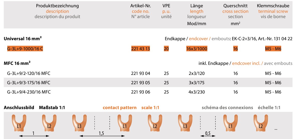Safnskinna 3p+snerta L1-l2-l3(Sn) G-3l+9-1000/16mm2, 3p Gaf.